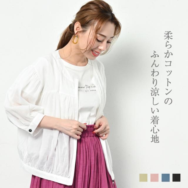 ノーカラージャケット レディース 夏 ノーカラー アウター シャツ ブラウス ジャケット 七分袖 羽織 薄手 綿 ジップアップ ブラウス ショート 襟なし カーディガン 白 黒 ピンク ベージュ ブルー 涼しい 羽織り 透け感 冷房対策