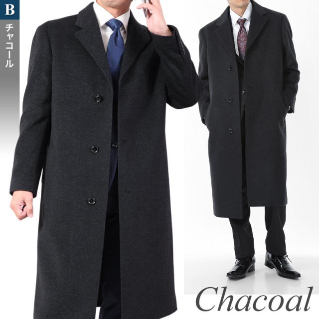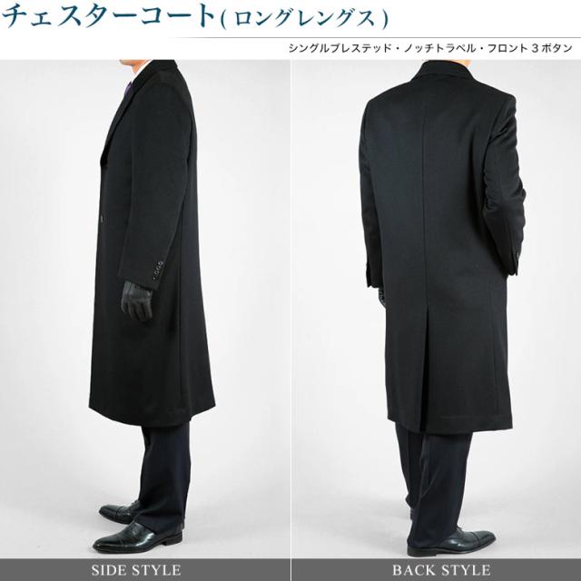 カシミヤ混紡ウールを使用した格調高いロングチェスターコートです。外套(オーバーコート)の中でも極めて格調高いのはチェスターコート。スーツスタイルに合わせたビジネスコートとしてはもちろん、冠婚葬祭の際も通用する紳士の必須アイテムです。カシミアを混紡したウールのコート地で作られ、シングルブレステッド、ノッチトラペル、フロント3ボタンタイプ。膝がすっぽり隠れるロングコート、ブラックとチャコールについてはより胸囲の大きいワイド版もご用意しております。