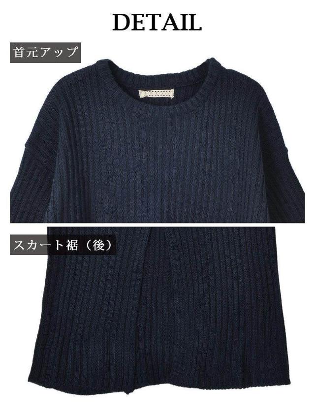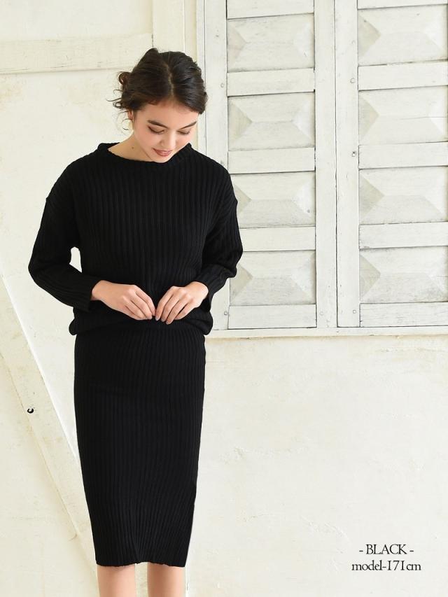 ☆それぞれ単品使いしやすいシンプルなデザインの膝丈ワンカラー2pニットワンピースはバックスリット入りで後ろ姿も可愛い1着♪