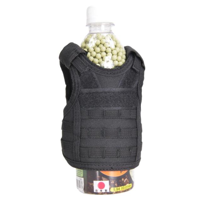 350ml〜550ml程度の缶や瓶などに対応しており、直径8cm程度までの水筒にも取り付けられます。まるで実物のプレートキャリアのような作りで、肩と腰部分のベルクロによる着脱が可能。ナイロン製のボディもタフな質感を再現しており、身近なボトルもミリタリー仕様にチェンジさせることができます。