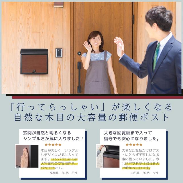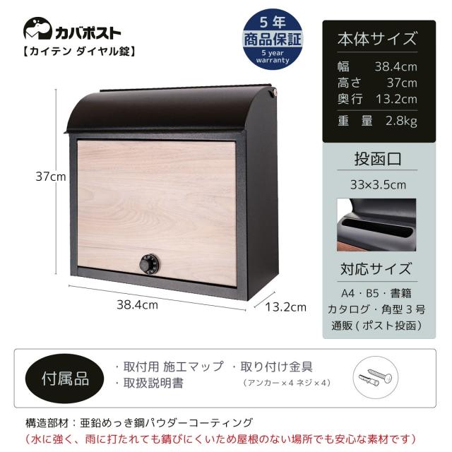 大容量ながらシンプルな木目調のデザイン。和風、洋風を問わず、モダンな多くの玄関を自然に彩ります。玄関や壁の色に寄らず、オシャレに飾るデザインです。さらに、カバポストのメーカー保証は5年間。長く風雨にさらされる郵便ポストだからこそ、しっかりとしたアフターサービスを行っております。詳しくは付属の保証書をご確認ください。