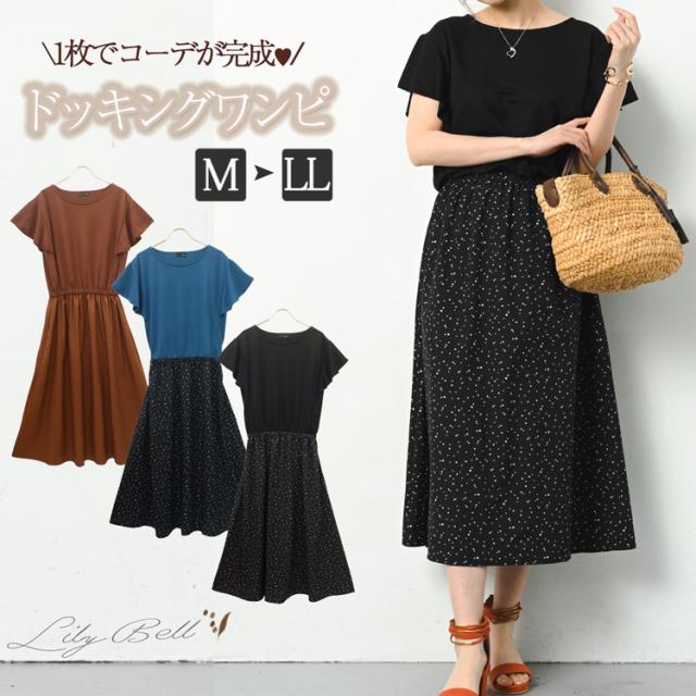ロングワンピース 半袖 レディース 切り替えワンピース ドッキングワンピース 夏ワンピース 夏 切り替え ドッキング ワンピース ロング きれいめ 大人可愛い 半袖ワンピース ウエストシャーリングワンピース ウエストギャザーワンピース 柄 ドット 無地 M L LL 大きいサイズ