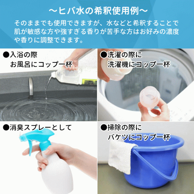 | 主なご利用法 | (入浴剤)お風呂にコップ一杯 約100cc 抗菌、防虫(ゴキブリ・ダニなど)、消臭、精神安定、アロマ効果 (ペット) 皮膚トラブル・虫よけ(防虫)・消臭・トイレ掃除・マット消臭 など (お掃除) 台所・お風呂(カビ)・トイレ(消臭効果)・フローリング・畳・柱・テーブル・下駄箱・エアコンなど抗菌と消臭 (癒し効果) お風呂・アロマ・加湿器(機器により使用注意) こちの商品は飲めませんのでお子様の手の届かない場所に保管してください |