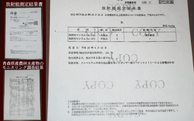 | 青森県では、東京電力(株)福島第一原子力発電所の事故による影響の有無を確認するため、 県内の環境放射線の監視を強化しています。 これまで行ってきた測定の結果では、空間放射線量率に異常は認められていません。 更新日:2013年9月20日 原子力安全対策課 【抜粋】 |