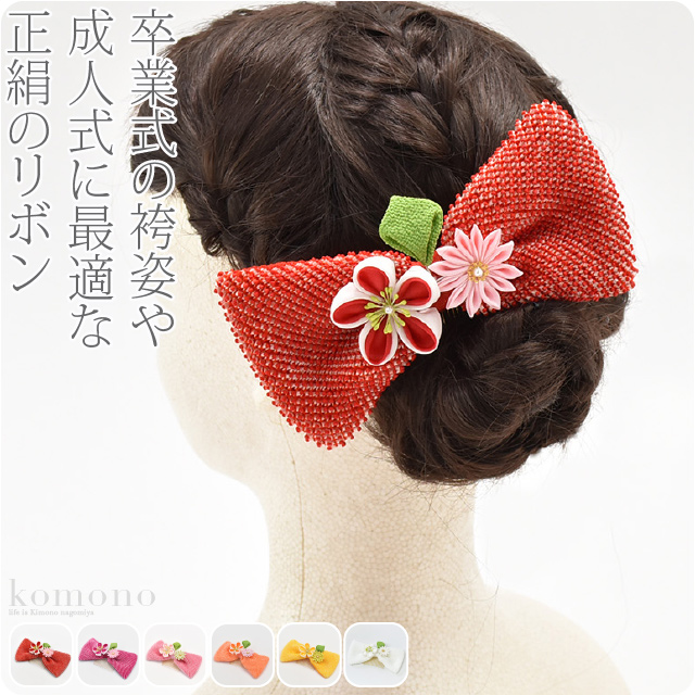 和装 髪飾り 卒業式 袴 通年用 日本製 大正 リボン 正絹 四つ巻き絞り つまみ細工 コーム 礼装 大人 レディース 女性10020880