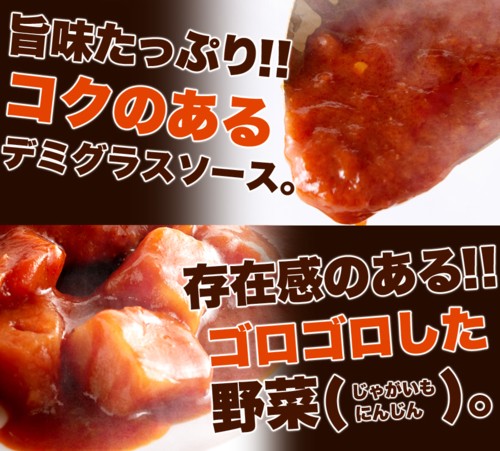 ■原材料名:ハンバーグ、野菜[玉ねぎ、じゃがいも(遺伝子組み換えでない)、人参、生姜、にんにく]、トマトペースト、豚脂、小麦粉、還元水あめ、デミグラスソースベース、ビーフエキス、食塩、全脂粉乳、トマトケチャップ、ウスターソース、しょうゆ、香辛料、加工でん粉、調味料(アミノ酸等)、着色料(カラメル、ベニコウジ、ラック)、pH調整剤、香料、香辛料抽出物、(原材料の一部に鶏肉を含む)