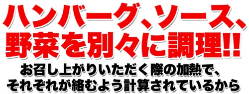■ハンバーグ、ソース、野菜を別々に調理し、お召し上がりいただく際の加熱で、それぞれが絡むように計算されているから旨いっ!