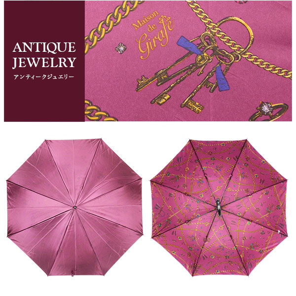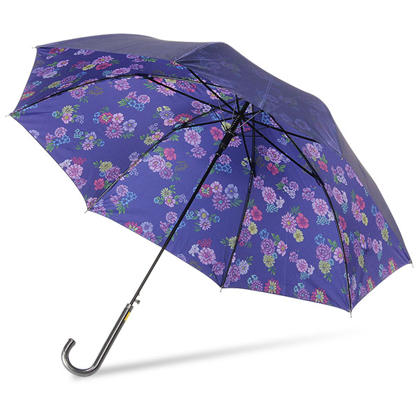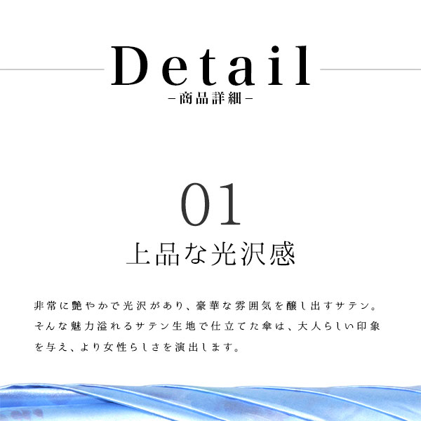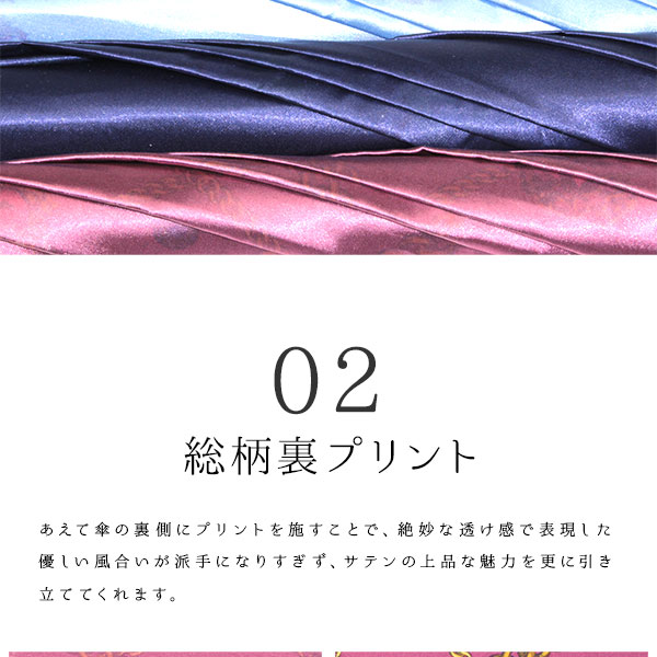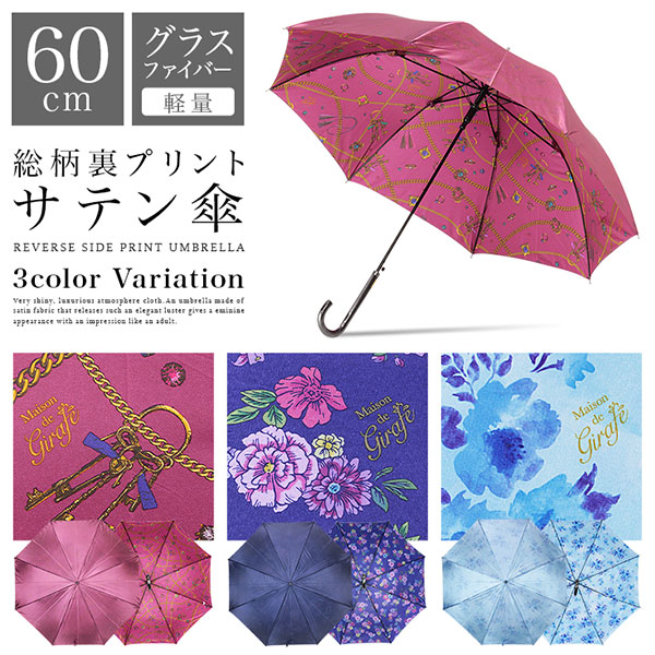 シャイニーに煌めくサテン生地に、裏プリントがオシャレなレディース傘。グラスファイバー仕様だから丈夫で軽い。