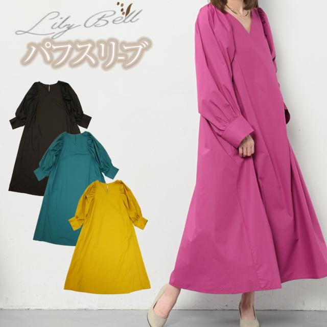ロングワンピース レディース マキシワンピース マキシ丈ワンピース 秋 長袖 パフスリーブ ロング マキシ ワンピース ボリューム袖 Vネック 黒 グリーン ピンク マスタード M L 秋冬 きれいめ エレガント 上品 大人可愛い マキシ丈