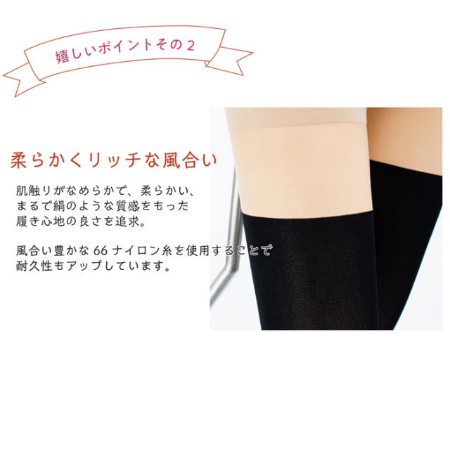 | 特長 | ・マチ無しですっきり ・つま先スルー ・黒い部分は80デニール相当 |