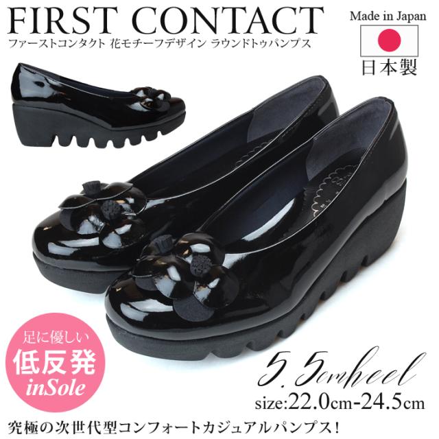 ファーストコンタクト パンプス 痛くない 疲れない 歩きやすい ウェッジソール 花 黒 エナメル 外反母趾 通勤 仕事 靴 日本製