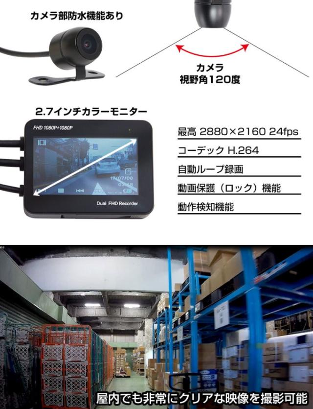 カメラは広角120度、フルHDで音声も同時に録音。自動ループ録画、ロック機能、動作検知機能などを備えています。