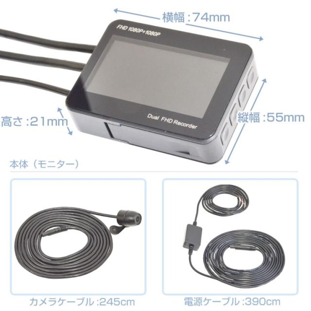 ■内容品:本体(モニター)、カメラ×2(ケーブル長245cm)、SDカード32GB、ACC電源(ケーブル長390cm)、カメラ取り付け用器具×2、日本語取扱説明書