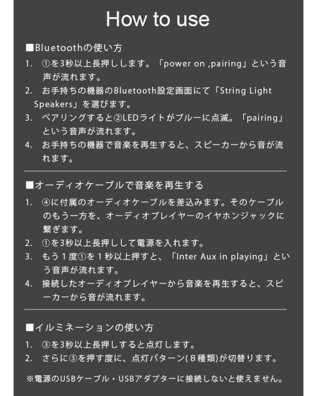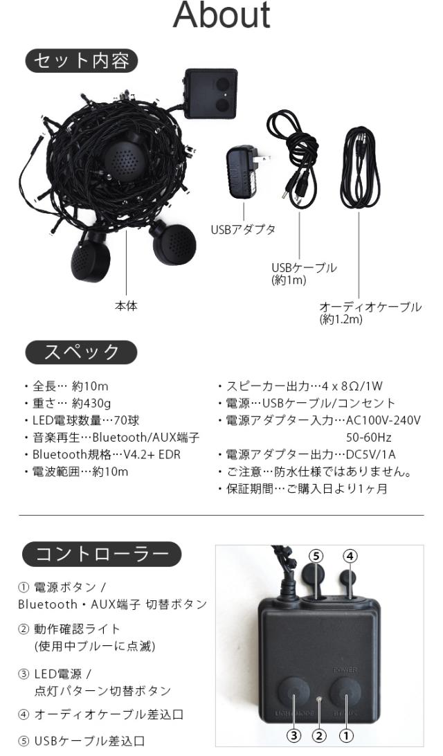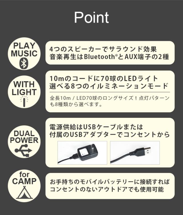 パーティーやイベントの雰囲気づくりにピッタリ!わくわくする気分を盛り上げてくれる、Bluetoothスピーカーズ・ストリングLEDライトのご紹介です。こちらはLEDストリングライトとスピーカーが1つになったアイテムです。スピーカーはBluetooth、またはAUX端子(付属のオーディオケーブル)で音楽とライトが楽しめます。約10mの全長で暖色LEDが70球つらなる、迫力のストリングライトです。大きめなクリスマスツリーやオブジェなどに巻き付けたり、2本のツリーの間に吊り下げたり、広い空間でもデコレーションできます。スピーカーは4個ついて、広範囲に音楽を流せます。囲むように設置すればサラウンドサウンドの実現も可能です。電源供給は付属のUSBケーブルとコンセントです。お手持ちのモバイルバッテリーでも使えるので、アウトドアシーンでも活躍します。また8種類の点灯パターンがあり、素早く点滅したり、じんわり滲むように光ったり、盛り上げたいときや、リラックスしたい時などシーンによって変えられます。LEDライトだから、熱くならずお子様のいるファミリーでも安心して使えます。お財布に優しいのもポイント。