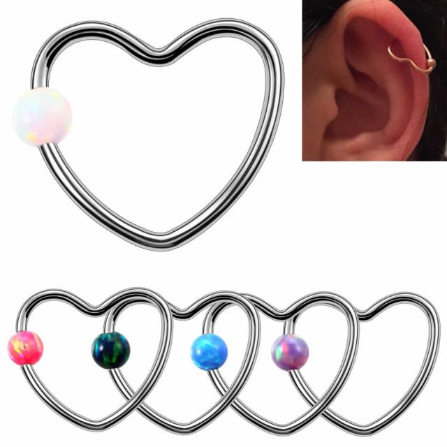 ステンレス製のハート型のキャプティブビーズリングにブルー、ホワイト、グリーン、ピンク、ブラックなど色鮮やかなオパールをセットした16ゲージのボディピアス。