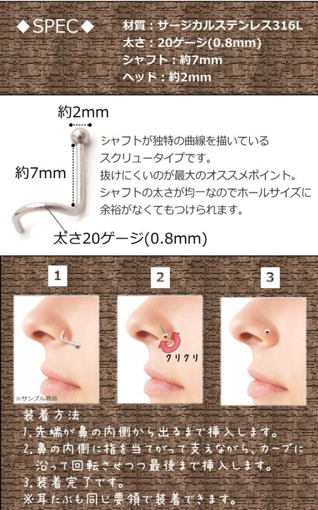 小鼻にするノーズスクリュー型ボディピアス。耳たぶや軟骨にも使えます。