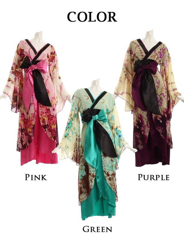 ☆高級感あるサテン地に被さるふんわりシフォンロングドレスが歩く姿を優雅魅せするキャバ嬢さん必見の和柄ドレス。