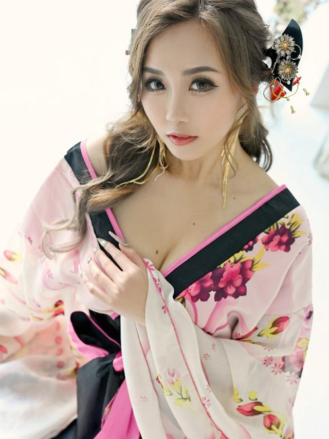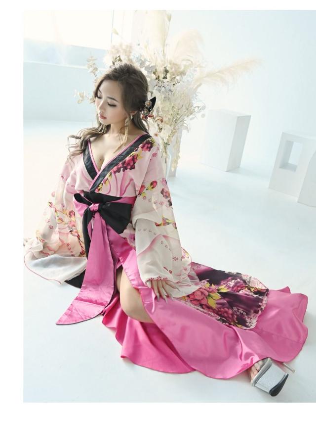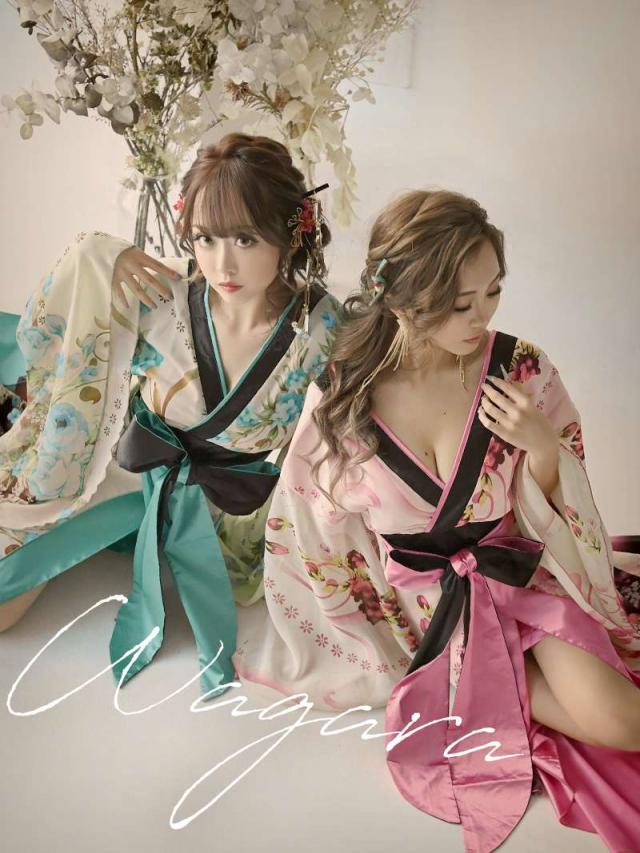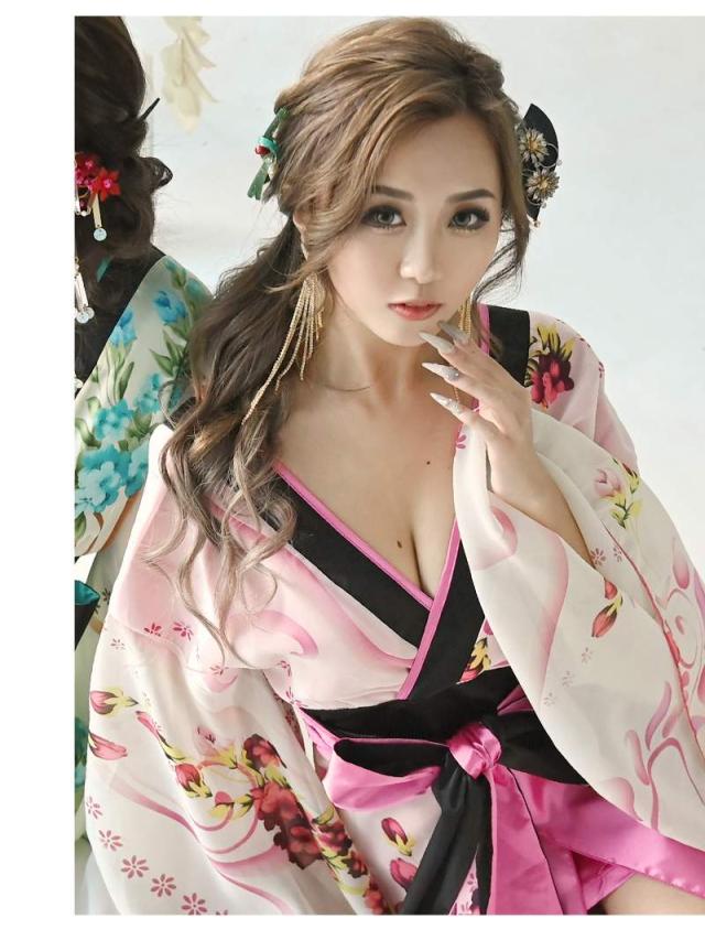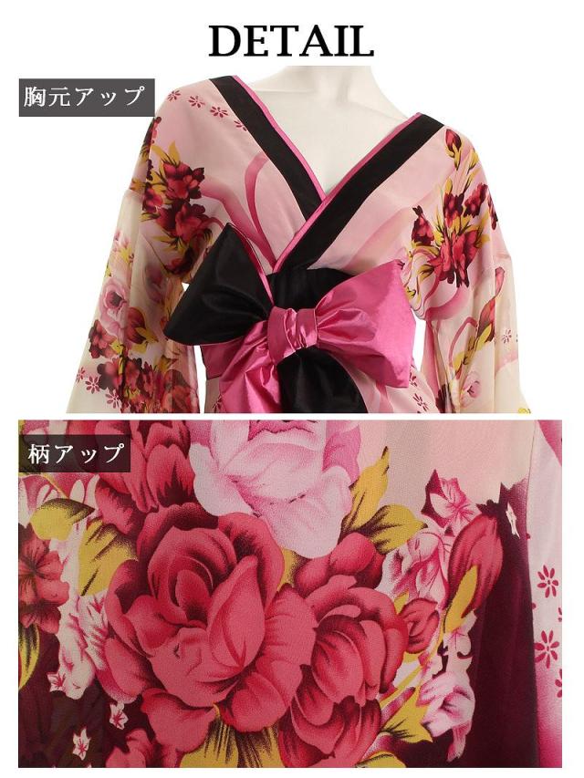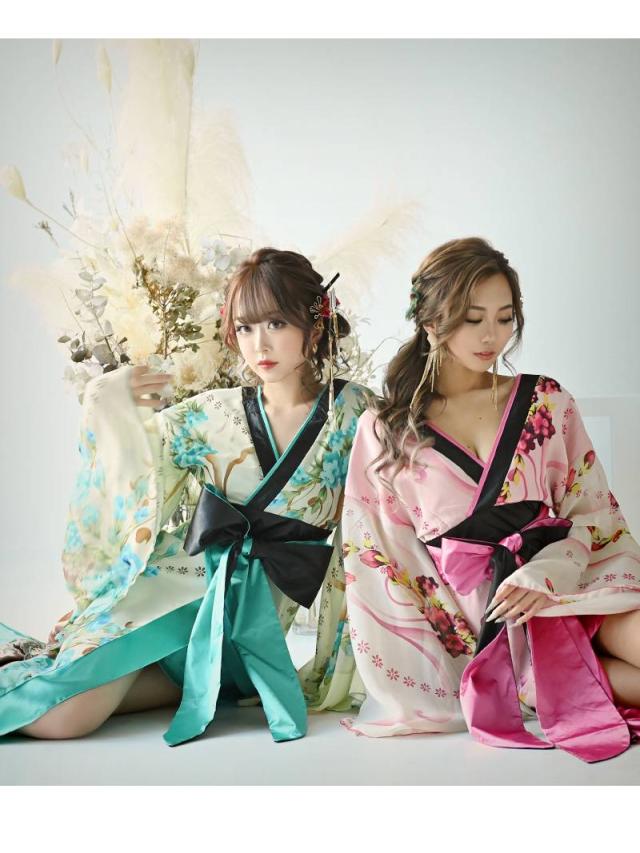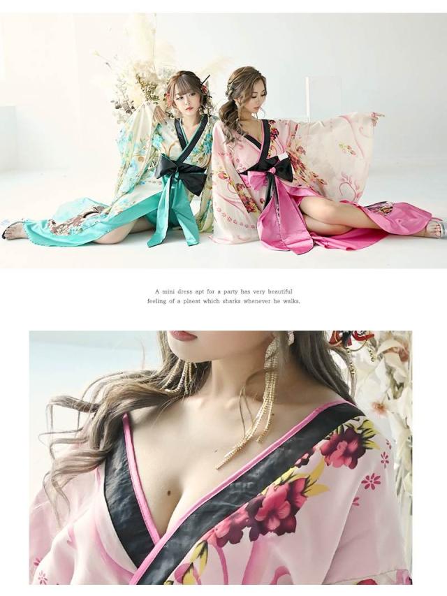 ☆帯を前で結んでいただくタイプなので結び方次第で着こなしのアレンジが自在な花魁ドレスは中ミニタイプで大胆美脚魅せ実現。