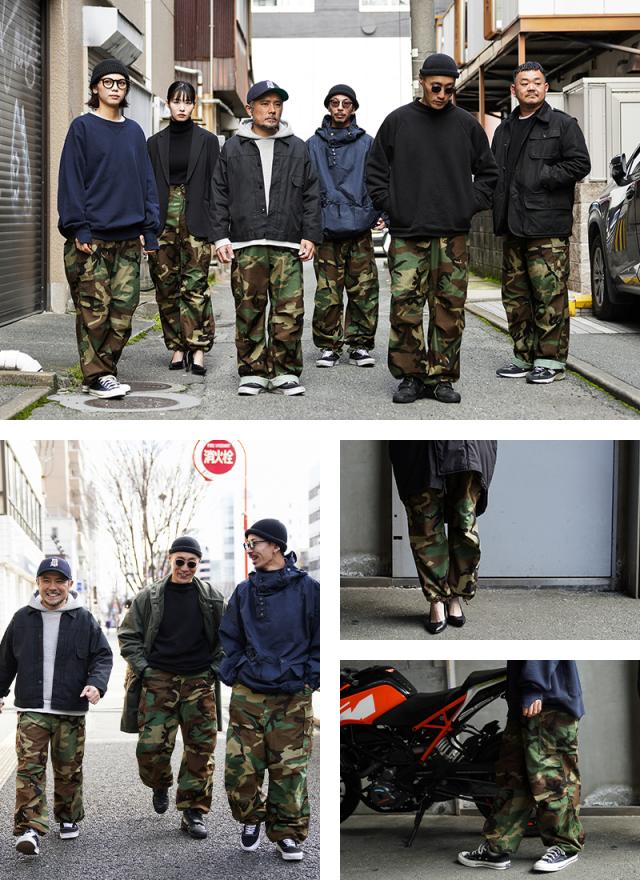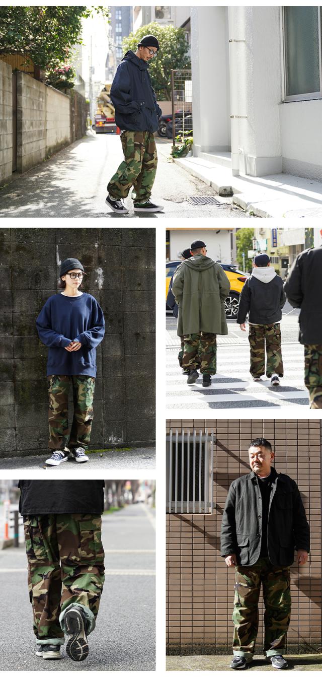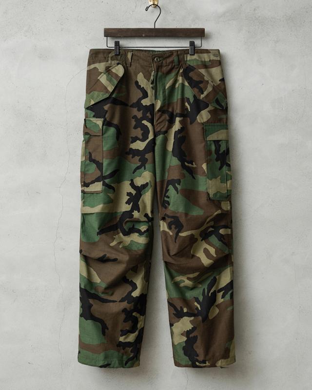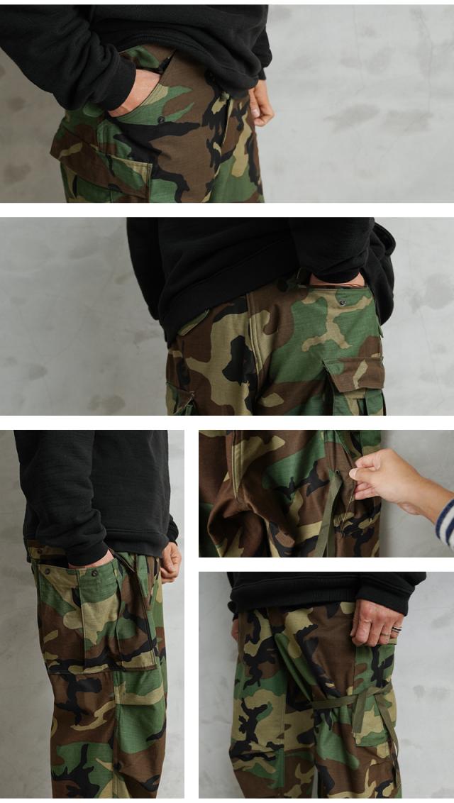 カーゴパンツの代名詞ともいえるデザインは60年代に採用されたアイテムながら、今見てもまったく古臭さを感じさせない名作となります。コットンとナイロンが混紡された耐久性の高いツイルにウッドランドカモの総柄のプリントが米軍を象徴する一本です。