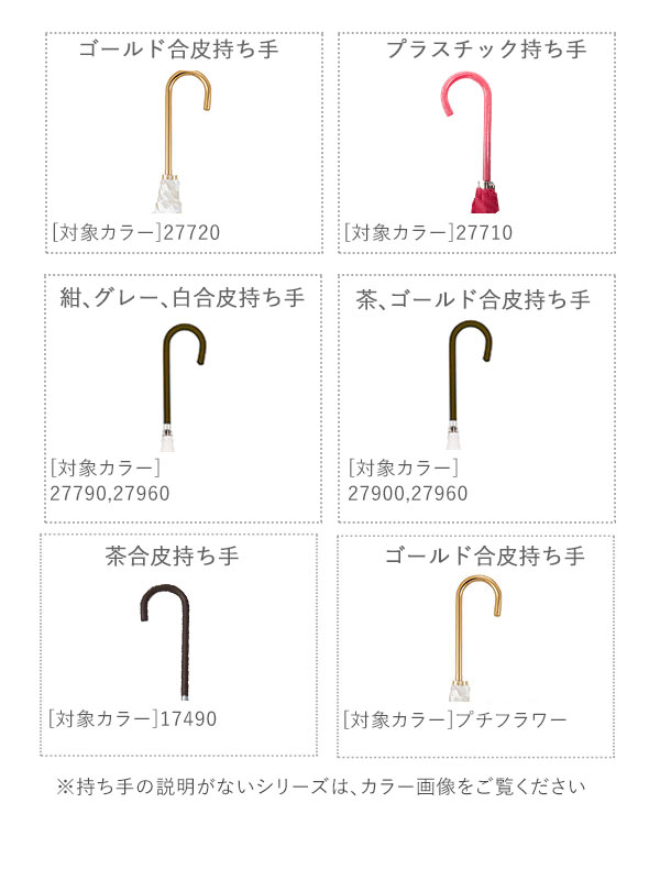 | 素材 | [傘生地の組成]ポリエステル100% [持ち手]合皮製、もしくはプラスチック製 ※傘生地の柄により、持ち手の素材が合皮製のものと、プラスチック製のものがあり、それぞれカラーが異なります。 |