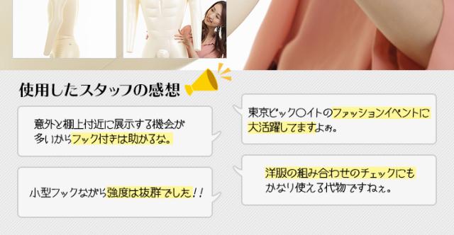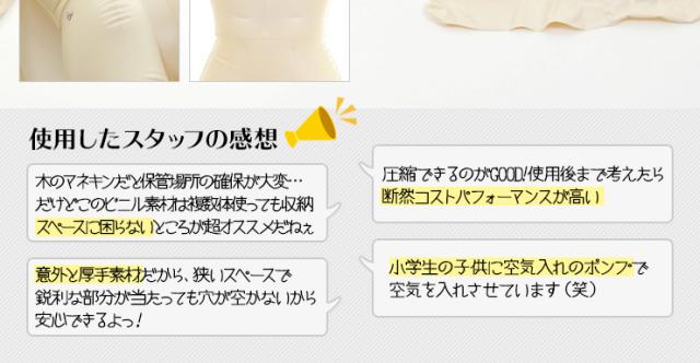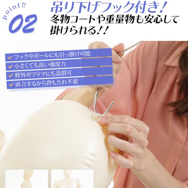 PVC製エアーマネキン(肌色)!空気抜けを防ぐ逆流防止弁付!ハンガーフックを引っ掛け、簡単ディスプレイ!例えば、フリーマーケットでイチオシの服をアピールしたい時、このエアーマネキンを使用すれば、目立つこと間違いなし!魅力的なディスプレイで、他の出品者と差をつけることができます。オークションに出品する際に使用しても、お洋服が引き立ちます!オシャレな演出にこだわりたい方には、必需品とも言えるでしょう。ブティックやショップでお使いいただくのもOKです。商品棚の上や、ちょっとした隙間など、物足りなさを感じるところに使用すれば、たちまち空間が華やかになります。ワンランク上の演出をしたい時にも、大活躍のスグレモノです!ご自宅用として、縫製の出来ばえのチェックや、大切な衣装の保管等にお使いいただいても便利です。お気に入りのコスプレ用衣装などを飾って、お部屋のインテリアとして使用するのもオシャレです。キーワード:男性用エアーマネキン エアーマネキンハンガー エアーマネキン 上半身 エアーマネキン 肌色 レディース ビニールマネキン 全身 マネキン 子供 クリスマスプレゼント 彼氏 彼女