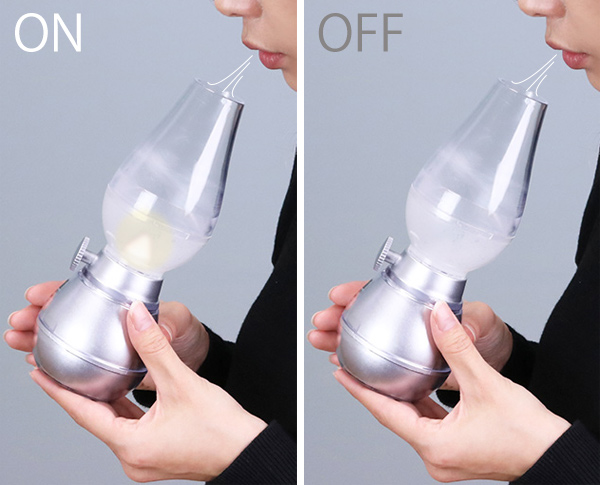 本物の火のように、ランタンの中にフッと息を吹きかけると灯りを消すことができます。また、灯りを付けるときにも同様に息を吹きかけると灯りが付きます。