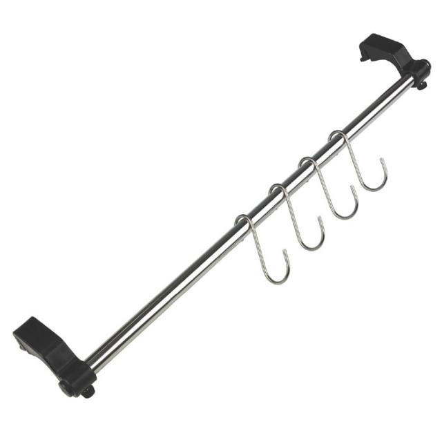 キッチンでの収納スペースと言えば、流し台下の扉の中や吊戸棚などで、その収納空間には限りがあり、また入れ方が悪いと取り出すのも一苦労ですよね。本製品は、レンジフードの溝を利用して固定することで、キッチンスペースを収納に有効活用できるハンガーです。見栄えはお世辞にも良いとは言えません、しかし空間を収納スペースとして有効に活用してみるのはいかがでしょう。フライパンやフライ返しなどのキッチンツールを吊るすことができ、使用時もスムーズに取り出せます。パイプは18-8ステンレス、フックはステンレスチールを採用していて、丈夫で清潔です。レンジフードの溝に挟み込んで取り付けるのでカンタンです。