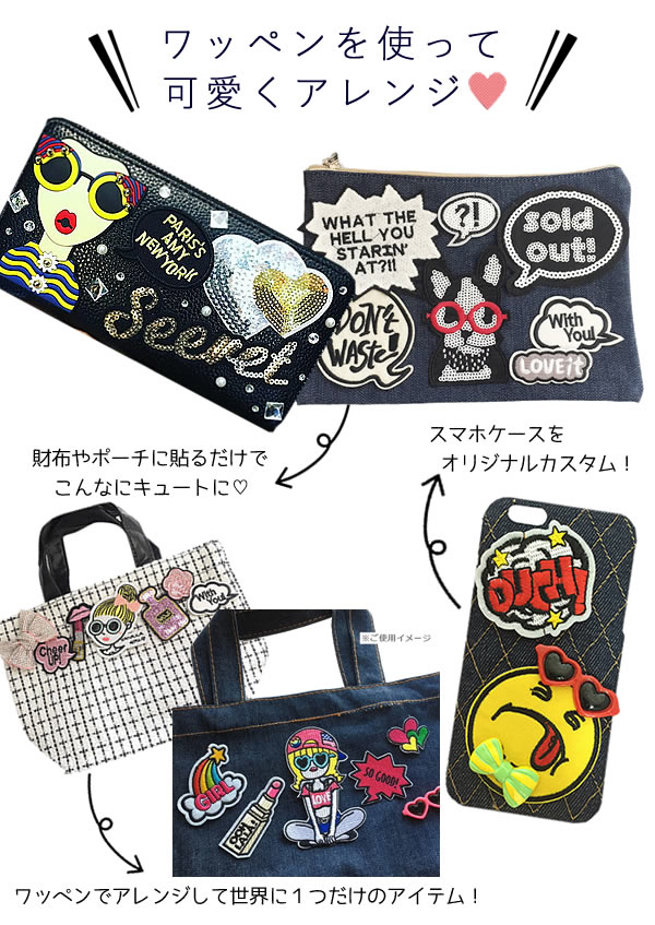 ワッペンをバッグやポーチなどに貼り付けて、自分だけのオリジナルデザインを作り出すことができます!