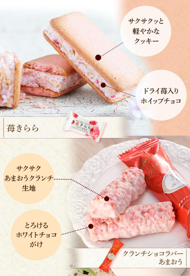いちご味フィリング(ショートニング、砂糖、麦芽糖)(国内製造)、マーガリン、小麦粉、液全卵、砂糖、アーモンド、でん粉、きな粉(大豆を含む)、うるち米加工食品、でん粉加工食品、乾燥卵白、ドライトマトエキス、いちごピューレ(あまおう)、いちご果汁、食塩/加工デンプン、膨張剤、香料(乳由来)、着色料(ラック、紅麹、ウコン、カロチン)、乳化剤、酸味料