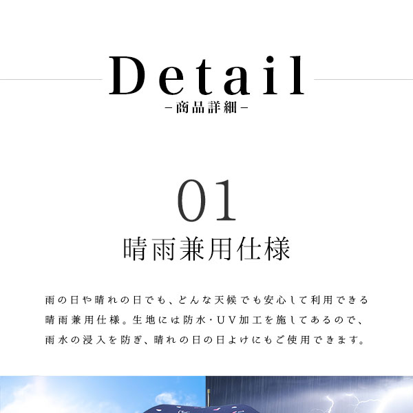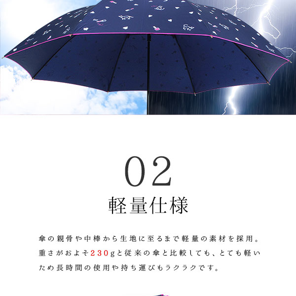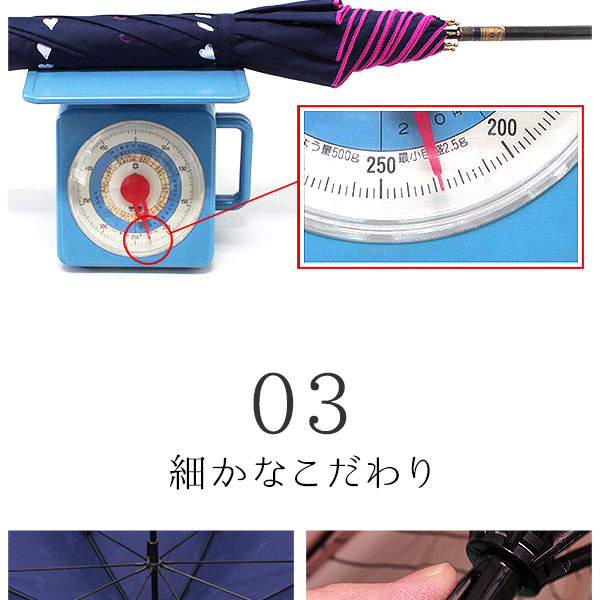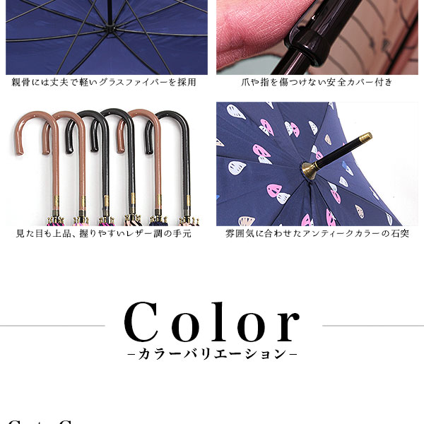 ■軽量かつUV加工を施した生地を使用したレディース傘。軽くて丈夫なグラスファイバーを採用しているので風にも強い。また、雨の日はもちろん、晴れの日の日よけとしてもご利用できます。<