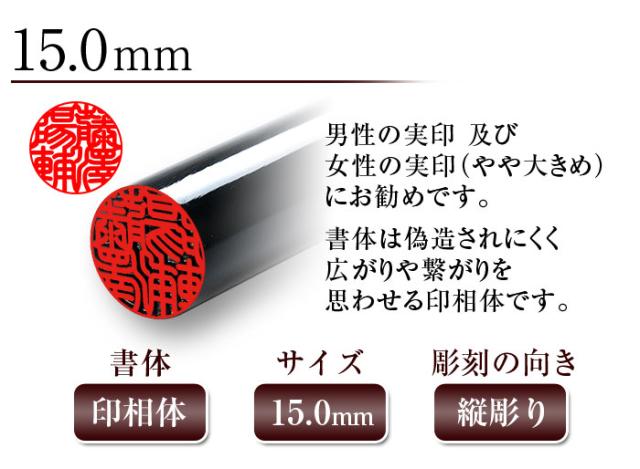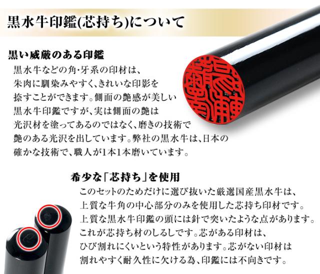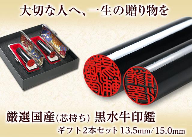 国産黒水牛印鑑 芯持ち 13.5mm 15.0mm 2本セット (厳選ギフトセット) ケース プレゼントボックス(和リボン・紺)付(宅配便発送)(tqb)
