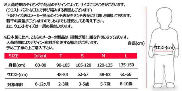 商品のデザインによってサイズのばらつきがございます。 (ウエスト・バストはゴムで伸び縮みする商品もございます) 上記サイズ表はメーカー提示のインチ表記をセンチ表記に計算した目安となり、商品によっては若干の誤差がございますので、予めご了承下さい。 また、ウエストサイズは一周の長さになります。 | ||||||||||||||||||||||||||||