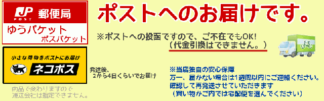 ※ご不在でもお届けできる、ポストへの投函でお送りします。メール便でしたら、通常、発送からお届けに4日くらいかかります。