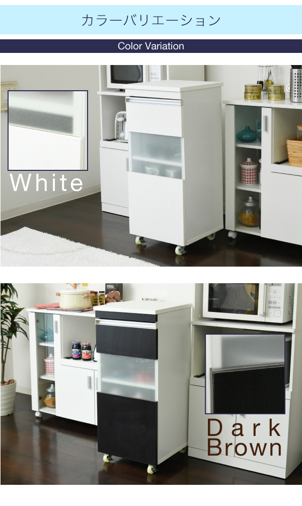 収納物に合わせて高さ調節ができる可動棚付きの食器棚。天板にもちょっと物を置いたりディスプレイしたりと、ちょうど良い高さです。キッチンの隙間に設置すれば、それまでのデッドスペースを有効活用できます。