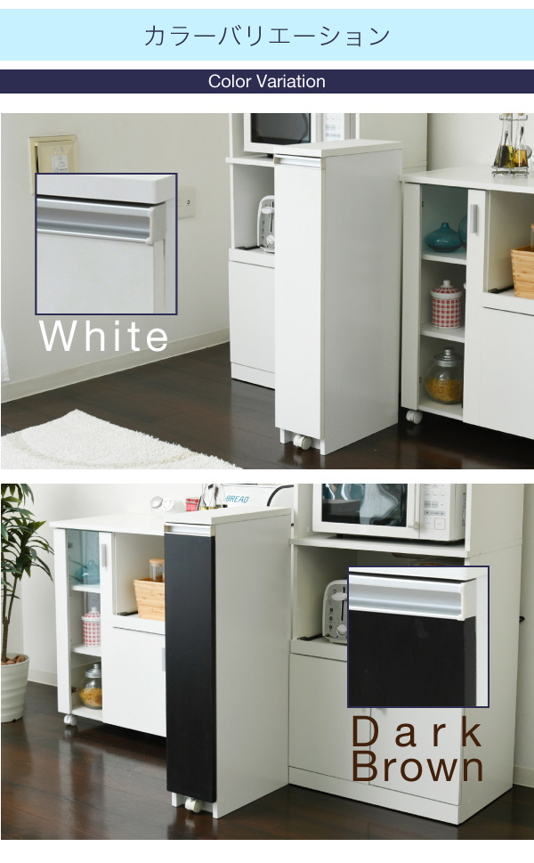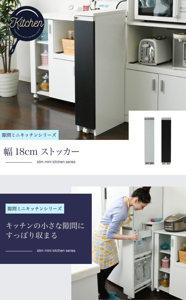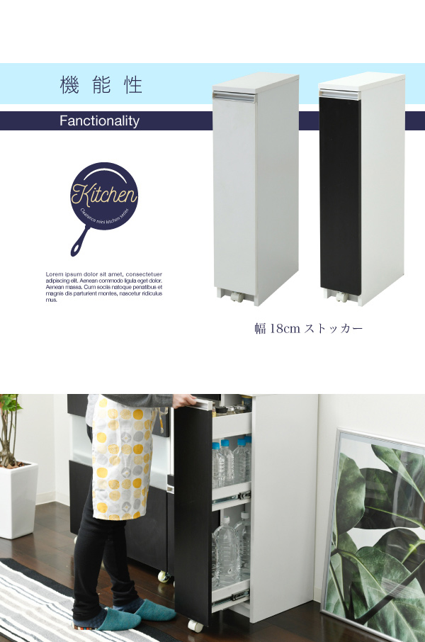 ちょっとした隙間にもスポッと入る幅18cmのストッカー。スリムな見た目ながらも中段には500mlのペットボトルが5本、下段には2Lのペットボトルが3本入る収納量。上段には小さな調味料などの収納にぴったり。たっぷり収納してもキャスター付きの引き出しで出し入れ楽々。
