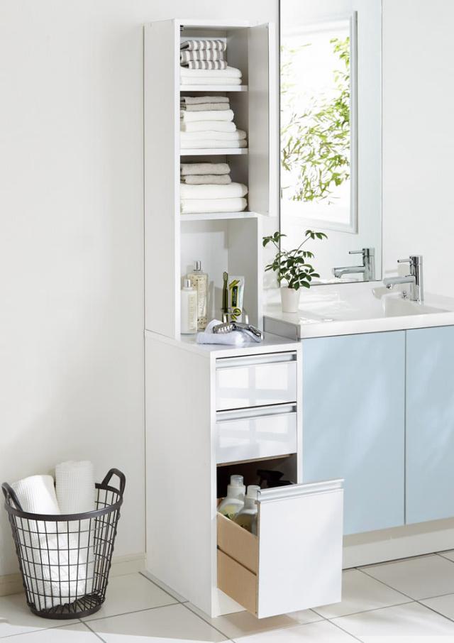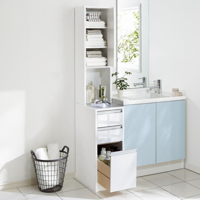 もう少しスペースが欲しい洗面台横に、高さがちょうどいいサニタリー収納。水ハネに強い中天板が洗面台の延長になるので置き場が増えて便利です。清潔感のある光沢仕上げのホワイト色です。