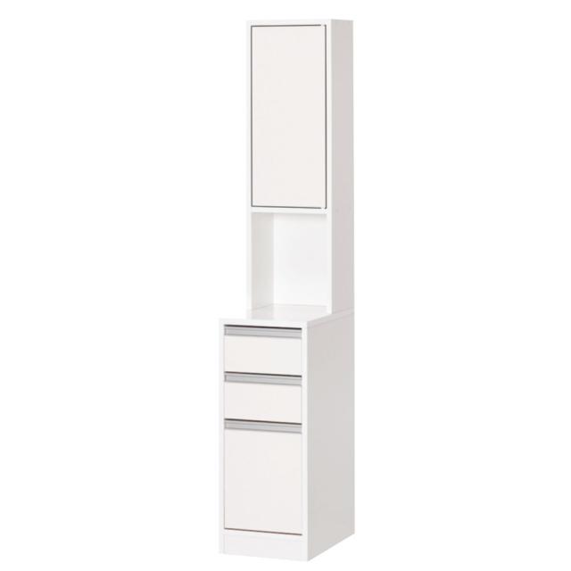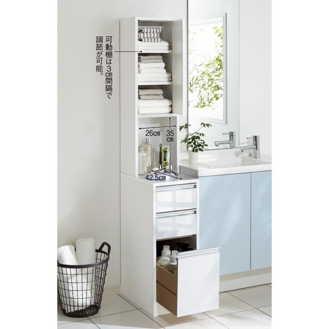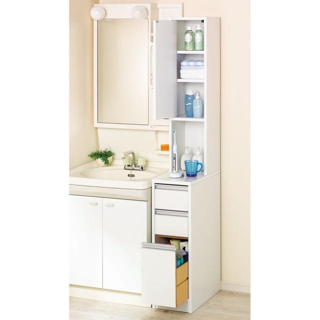・前面、天板は汚れてもお手入れがラクなポリエステル化粧合板 ・光沢仕上げで見た目もキレイな洗面所用すき間収納庫です。 ・最下段の深引き出しにはペットボトルも入る、引き出し高さ31.5センチ。 ※写真は幅25cmタイプです。