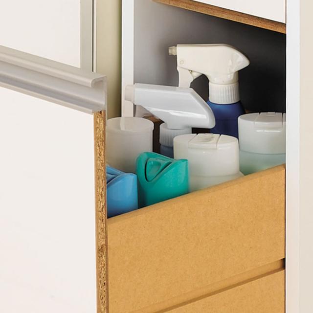 洗剤や柔軟剤のストックや、タオル収納にも便利な引き出し。最下段の深引き出しは深さ31.5cmで、背の高いボトル類も収納できます。