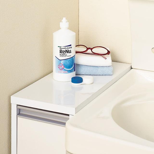 水ハネに強い中天板が洗面台の延長になるので、置き場が増えて便利です。コンタクトレンズ用品を置くのにも便利。