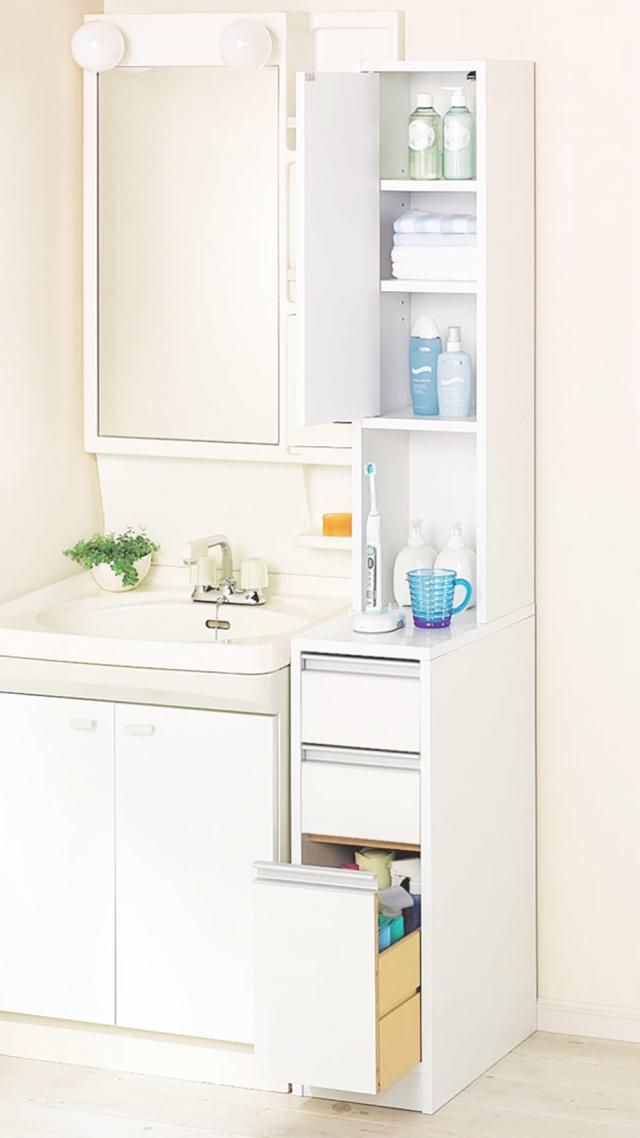 洗面化粧台横の、すき間に置ける収納庫。洗面台の延長としてスペースが広がります。扉は左右どちら開きにも取り付け可能。