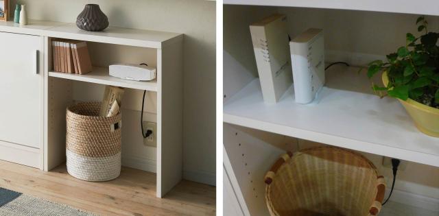 棚板とバックボードの間にすき間があるので、ラックに置いた家電のコードを通して、コンセントに挿すことができます。