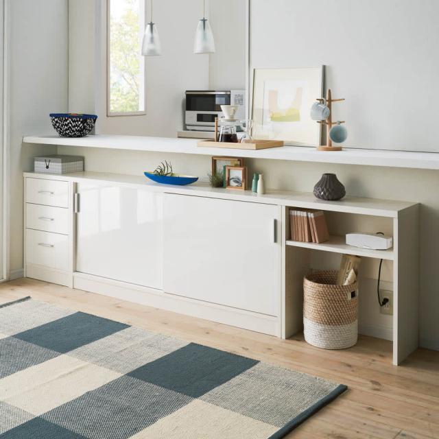 高さ、奥行、幅が選べる「カウンター下収納庫シリーズ」。薄型の引き出し・オープンラック・収納庫を組み合わせて、デッドスペースを収納に活用できます。前面には光沢が美しく、キズ・汚れに強い素材を使用。お部屋に清潔感をもたらしてくれるマルチ収納です。