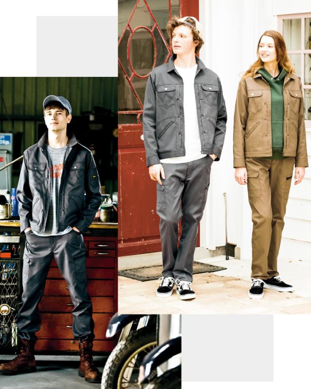 ベーシックなジーニングスタイルにストレッチ素材を組み合わせ実用性を追求、ポケットの「Wマーク」は仕事服に対する熱い想いと信頼の証。