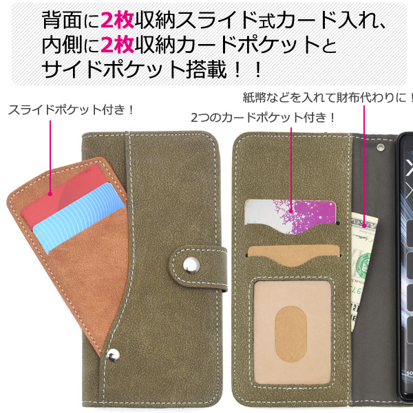 背面に2枚収納スライド式カード入れ、内側に2枚収納カードポケットとサイドポケット搭載した手帳型ケース。 背面にもスライド式のカードポケットを搭載!(実用新案登録済) ICカード収納に最適です。しかも横にスライドするので、スマホケースでICカードを使用する際に必要な「電波干渉防止シート」が必要ありません!!気軽にICカードを使用できます。 落下防止に便利なストラップホール付きです。しっかりと固定できるスナップボタン式を採用!マグネットタイプではないので クレジットカードなどの磁気カードも収納できます。 ※ケースをつけたまま撮影できますが、フラッシュ撮影時にケースの色が移り込むことがあります。