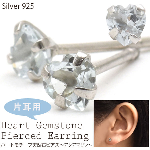 天然石ピアス アクアマリン ハートモチーフ 片耳用 シルバー925 アレルギーフリー ロジウムメッキ 3月誕生石 レディース アクセサリー