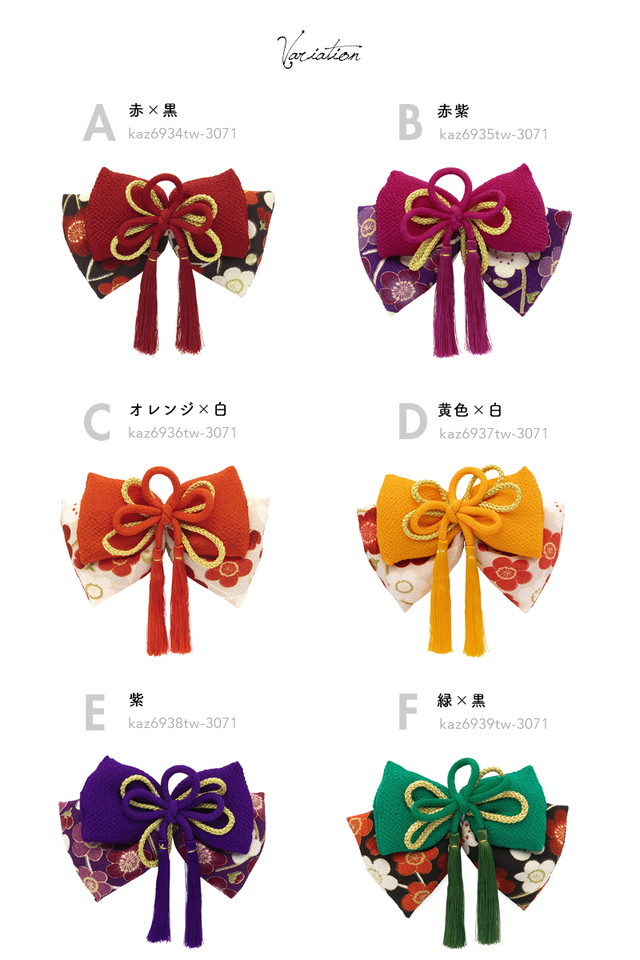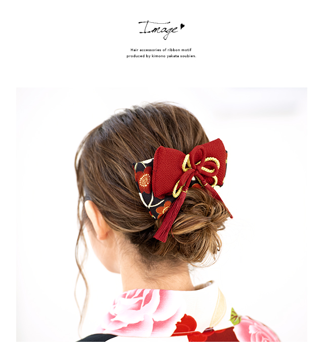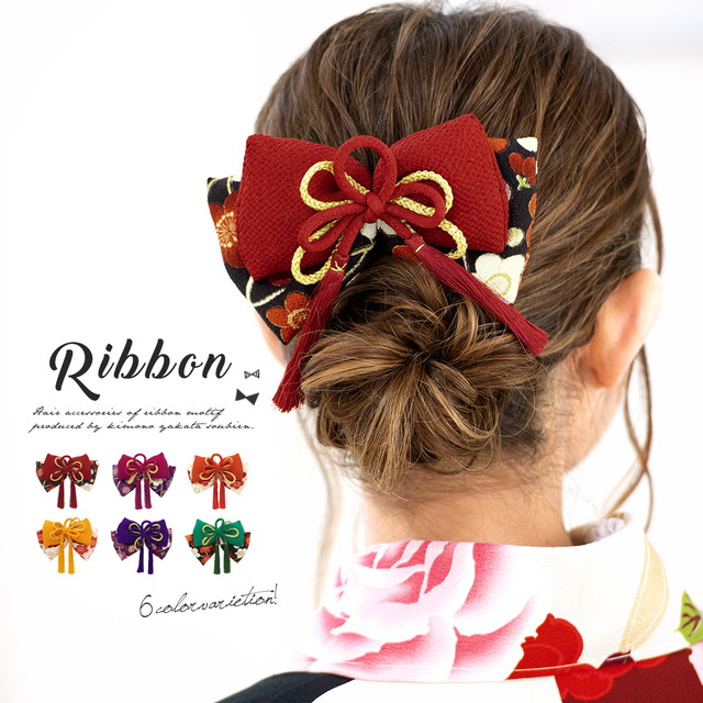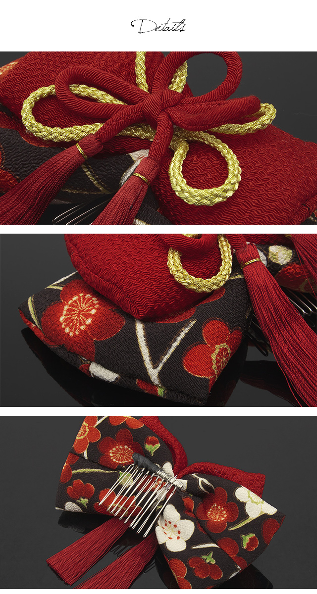 卒業式の袴姿におすすめなリボンの髪飾りです。 中綿の入った梅の花柄の縮緬(ちりめん)の生地や無地の縮緬の生地の中央に、金色の組紐や房付きの丸ぐけ紐が施された、ふっくらとしたリボンが仕立てられています。 付け部分は、簡単に挿せるコーム(櫛)式です。 こちらは細部まで丁寧に仕上げられた、信頼の高い日本製です。 成人式の振袖や卒業式の袴姿だけでなく、普段のお着物にもオススメします。