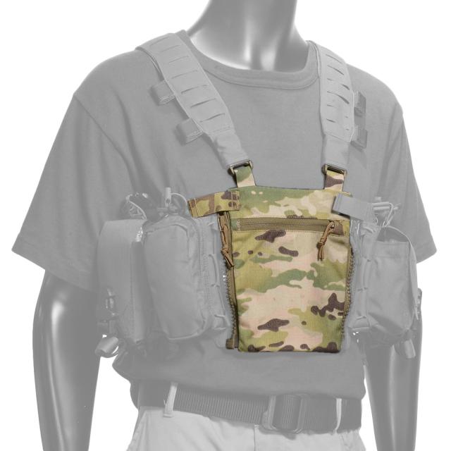 チェストリグの腹部に追加する事で、マガジンポーチなどが地面と干渉しないためプローン(伏せ撃ち)で構えても安定した射撃体勢がとれます。