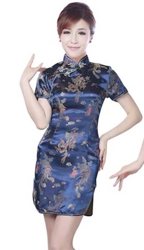 中華伝統柄・龍凰柄 ショート丈 チャイナドレス 紺色