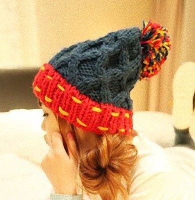 マルチカラー ローゲージ編みポンポン付 ニット帽