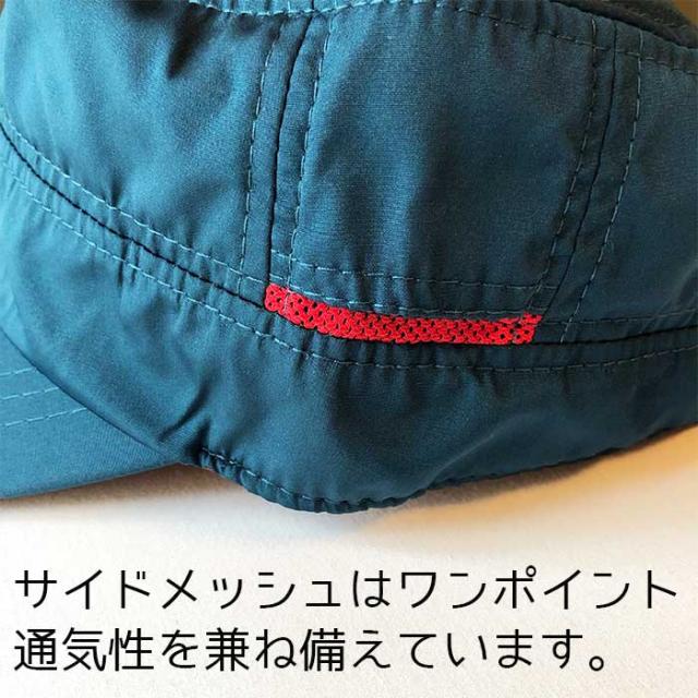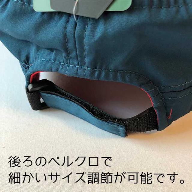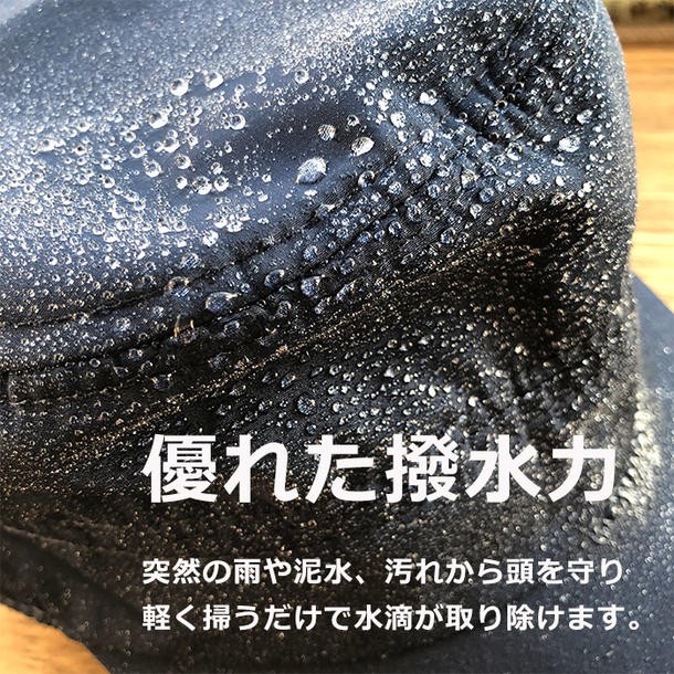 夏の突然の雨にも対応、撥水性ある素材で雨風、泥による汚れを防止します。 取り外し可能なあごヒモ付きです。